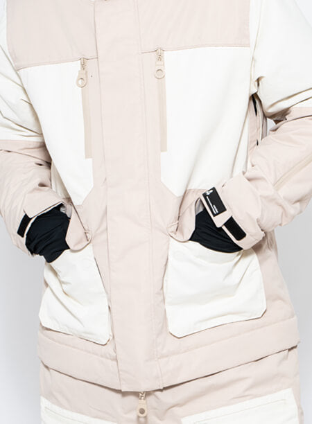 This is our sand & white colour way, with a utility style jacket & bib pants.