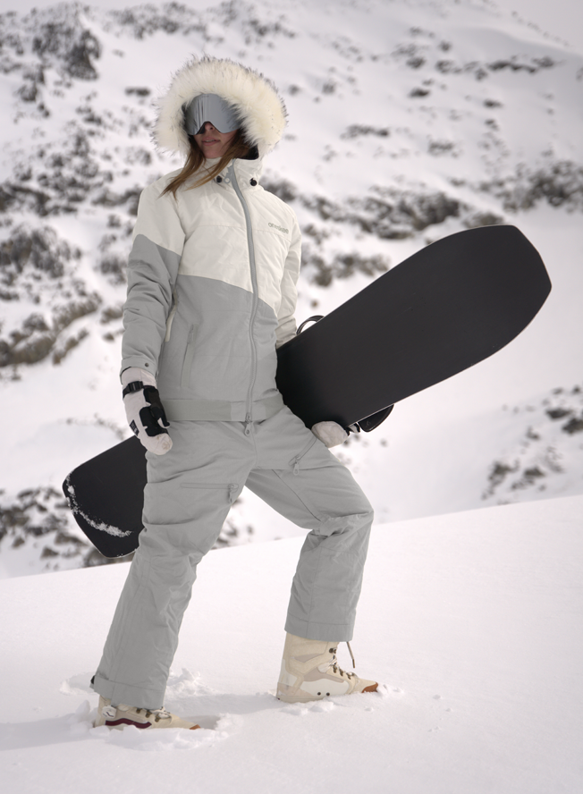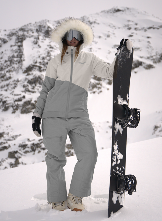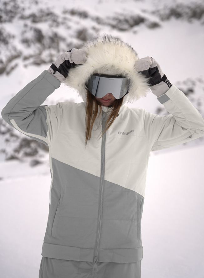 New in this season, this on-trend design in soft grey and cream has a diagonal split panel and features a detachable faux fur hood trim. It’s part of our 2-in-1 Acclimate™ range which features a 360° zip around the waist that transforms the Oneskee suit into a jacket in seconds, allowing you to use it independently during apres and the milder months. It’s made from our robust SnowSense outer shell fabric and the following technical features: